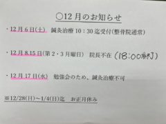 お知らせ (12月の予定) 2025年12月06日 12月8日 15日 月曜日は、院長不在(18時迄) 12月17日 水曜日 鍼灸治療できません よろしくお願いします。 « 前の記事へ 次の記事へ » アーカイブ アーカイブ 月を選択 2026年1月 2025年12月 2025年11月 2025年10月 2025年9月 2025年8月 2025年7月 2025年6月 2025年5月 2025年4月 2025年3月 2025年2月 2025年1月 2024年12月 2024年10月 2024年9月 2024年8月 2024年4月 2024年2月 2024年1月 2023年12月 2023年11月 2023年9月 2023年8月 2023年7月 2023年4月 2023年2月 2023年1月 2022年12月 2022年11月 2022年10月 2022年9月 2022年8月 2022年7月 2022年6月 2022年4月 2022年3月 2022年2月 2022年1月 2021年12月 2021年11月 2021年9月 2021年8月 2021年7月 2021年4月 2021年2月 2021年1月 2020年12月 2020年11月 2020年10月 2020年9月 2020年8月 2020年7月 2020年4月 2020年3月 2020年2月 2020年1月 2019年12月 カテゴリーカテゴリー カテゴリーを選択 新着情報(ブログ) 最近の投稿 あけましておめでとうございます㊗️ 年末年始のお知らせ お知らせ (12月の予定) 11月13日 (木)18:30迄 10月20日 月曜日は、完全予約制